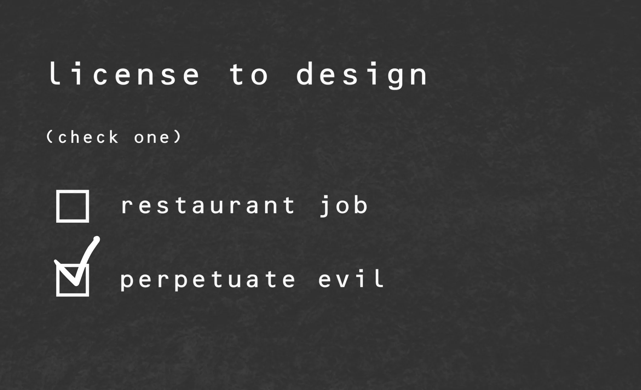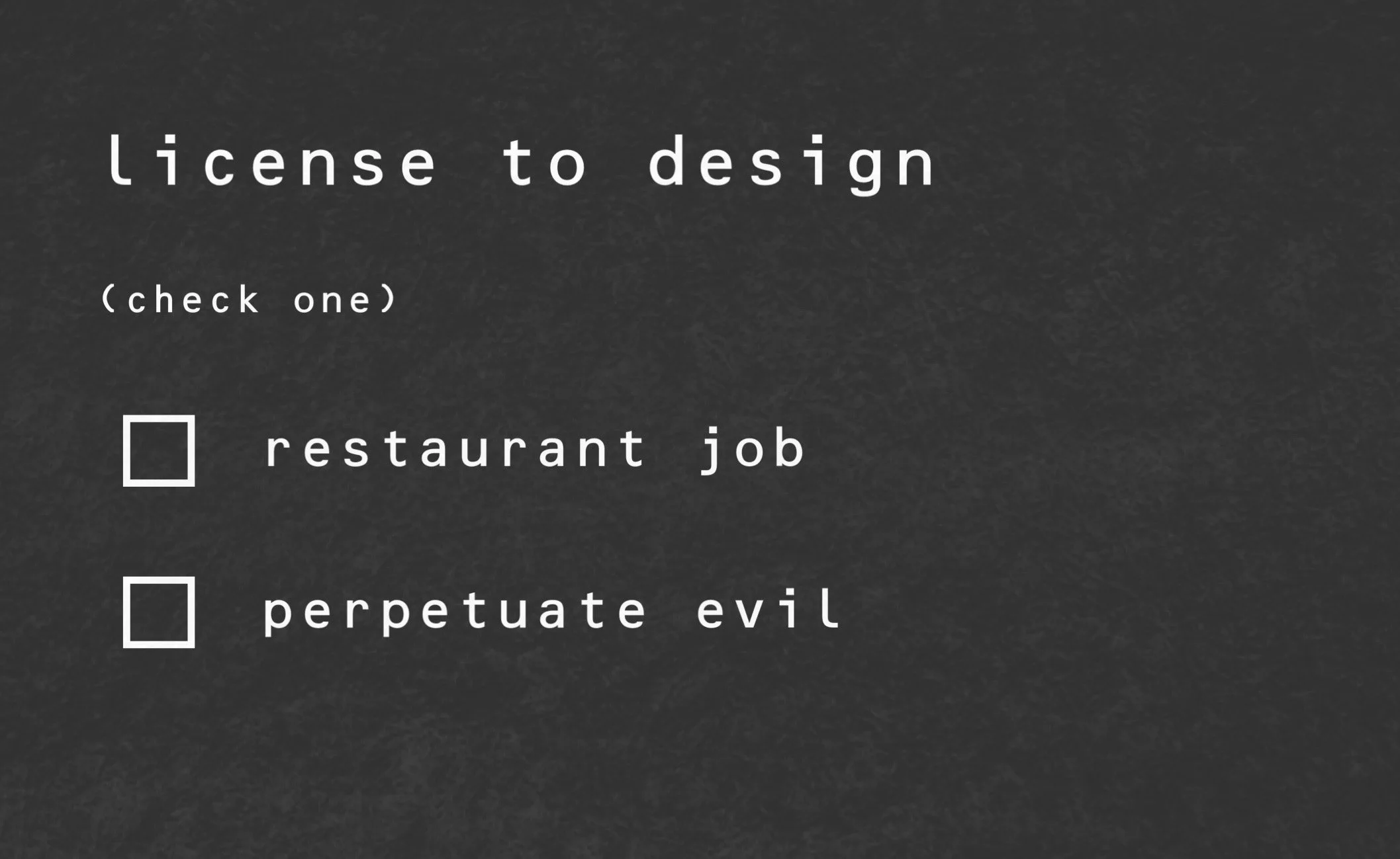 Okay, I think you’re ready. Here’s your license to design. Choose carefully.